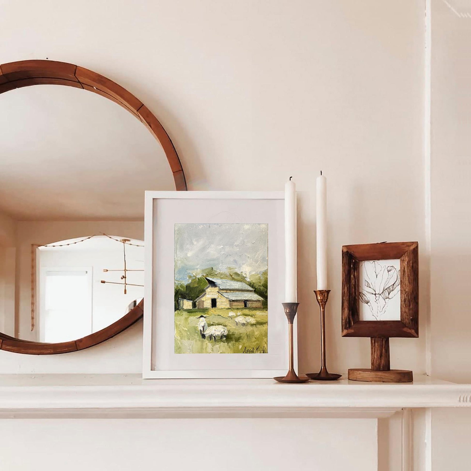 Abstract farm landscape oil painting on canvas. Sheep small painting for gift. Old barn art for wall decor. Fall painting for home wall decor