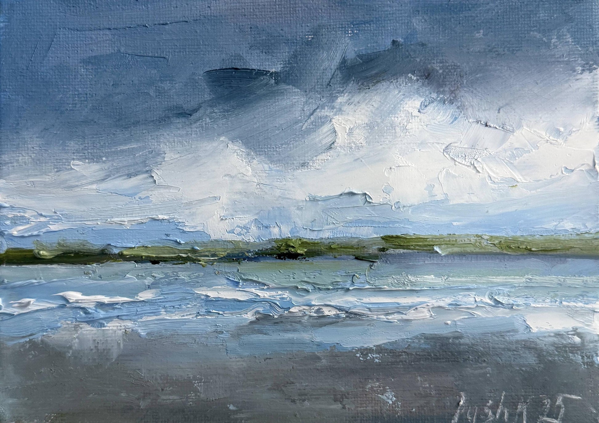 Ocean oil painting on canvas, inspired by serene coastal landscapes.