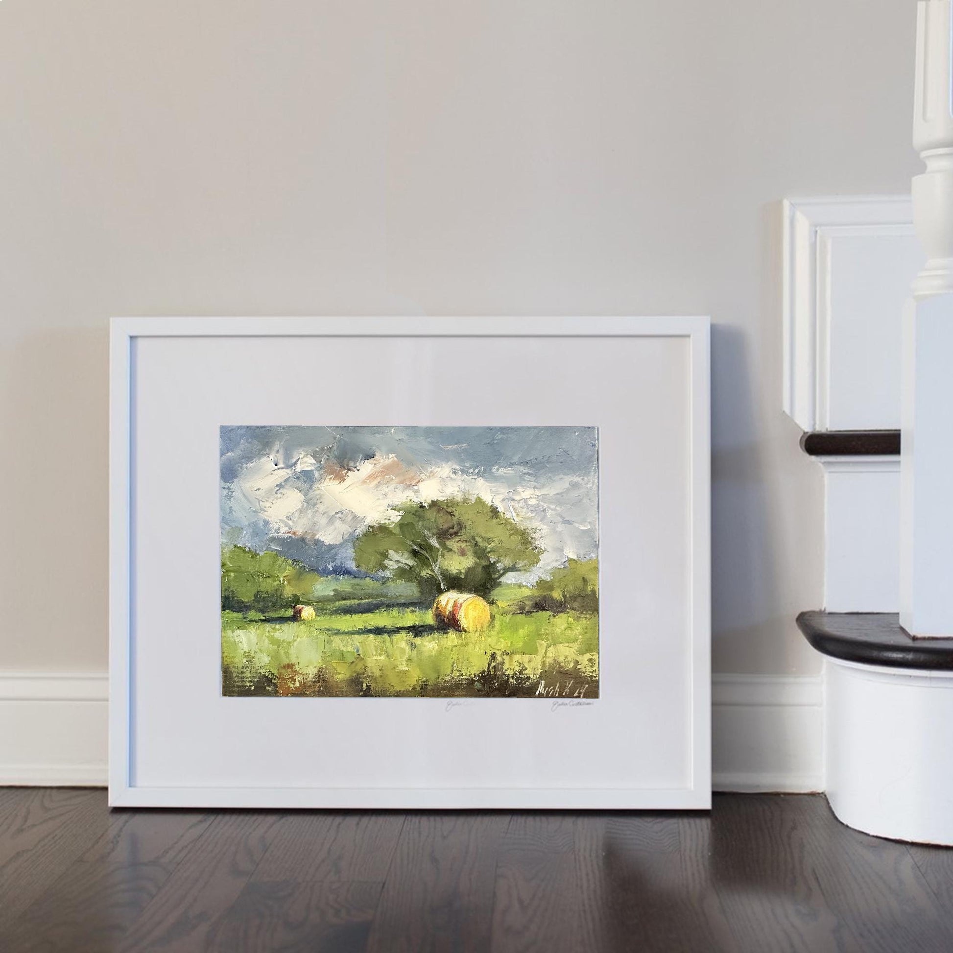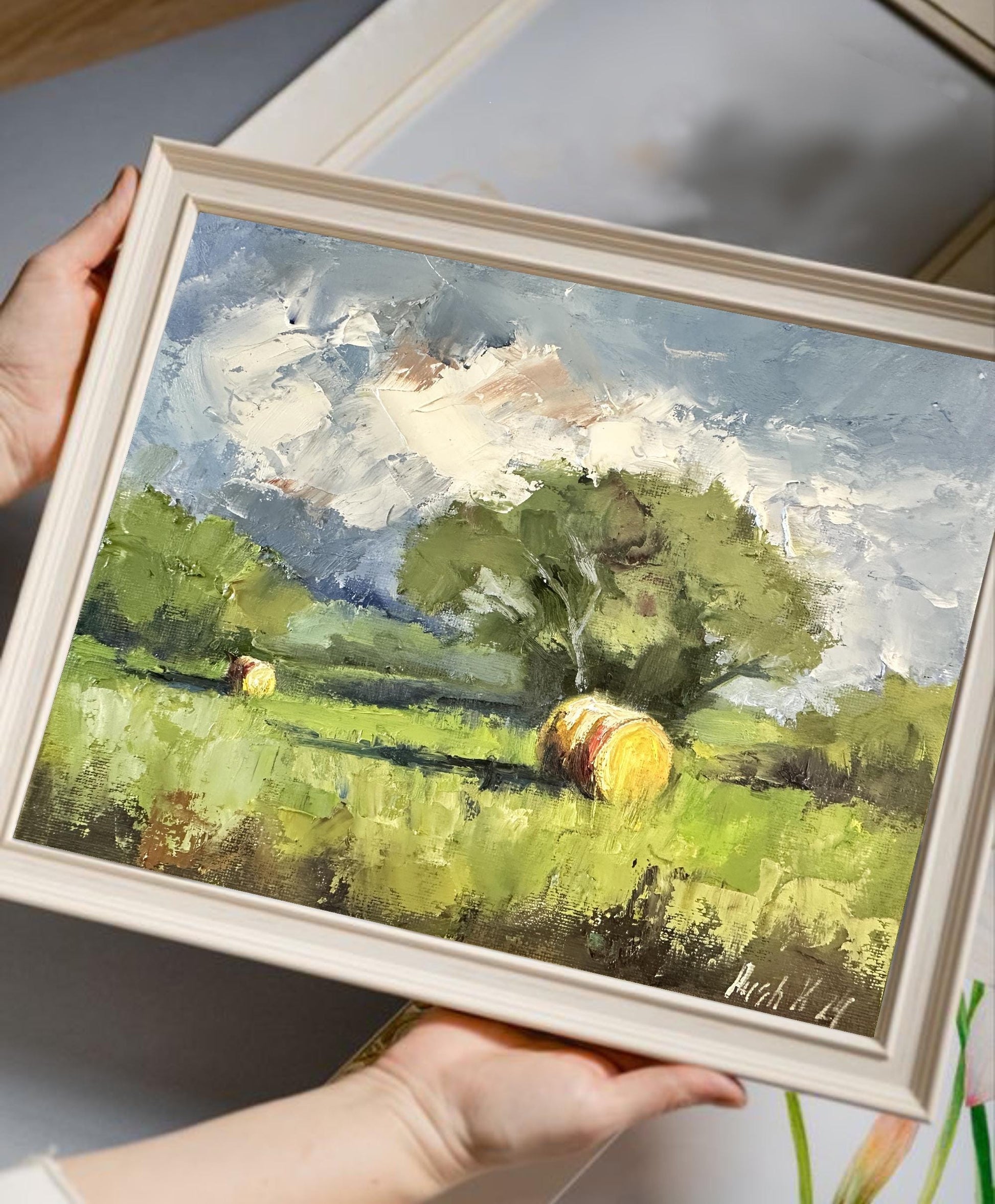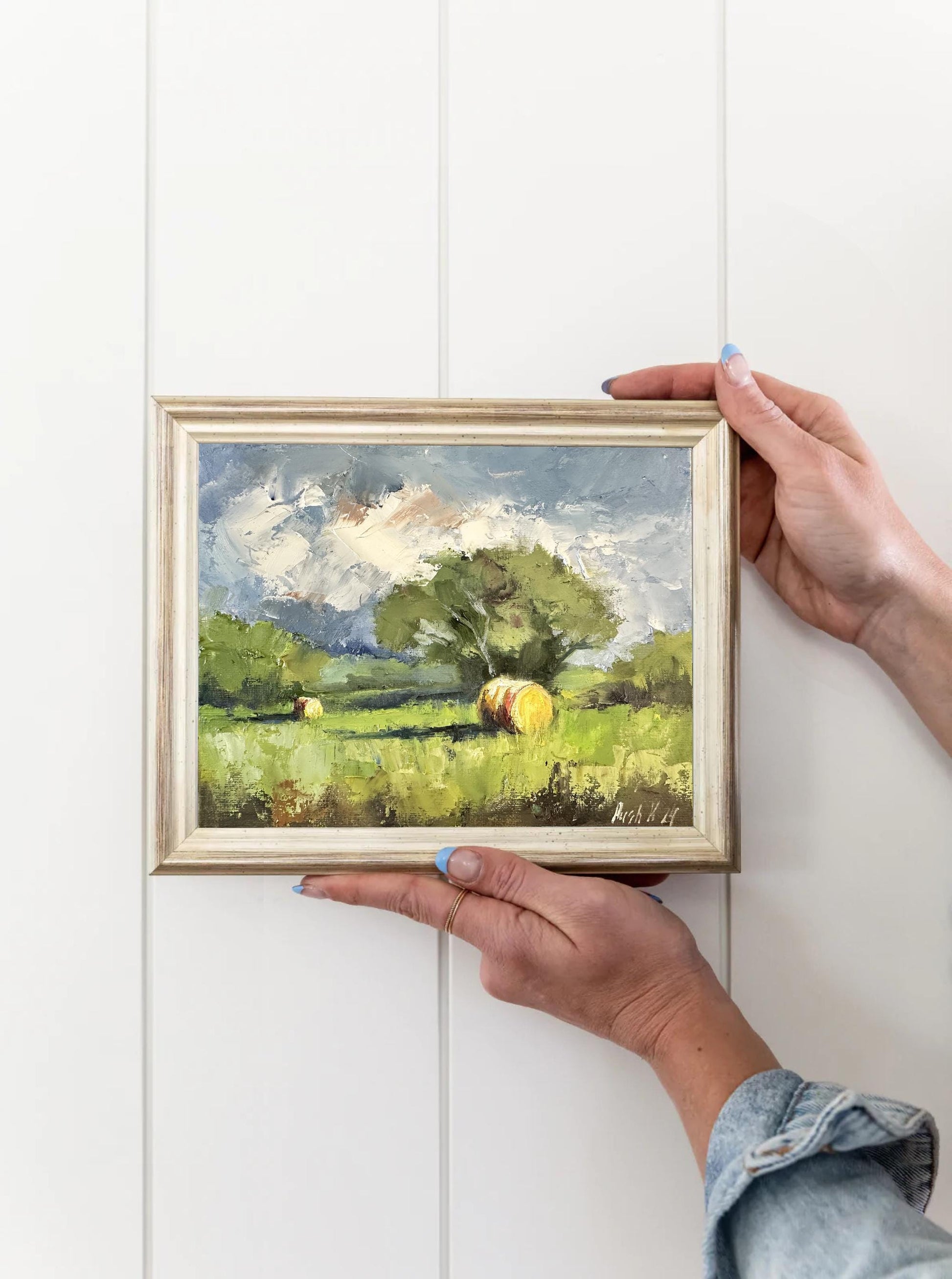 Fall landscape canvas oil painting for home wall decor. French mini canvas oil painting for sale. Rain cloud palette knife painting for gift. Farmhouse style art for home decoration.