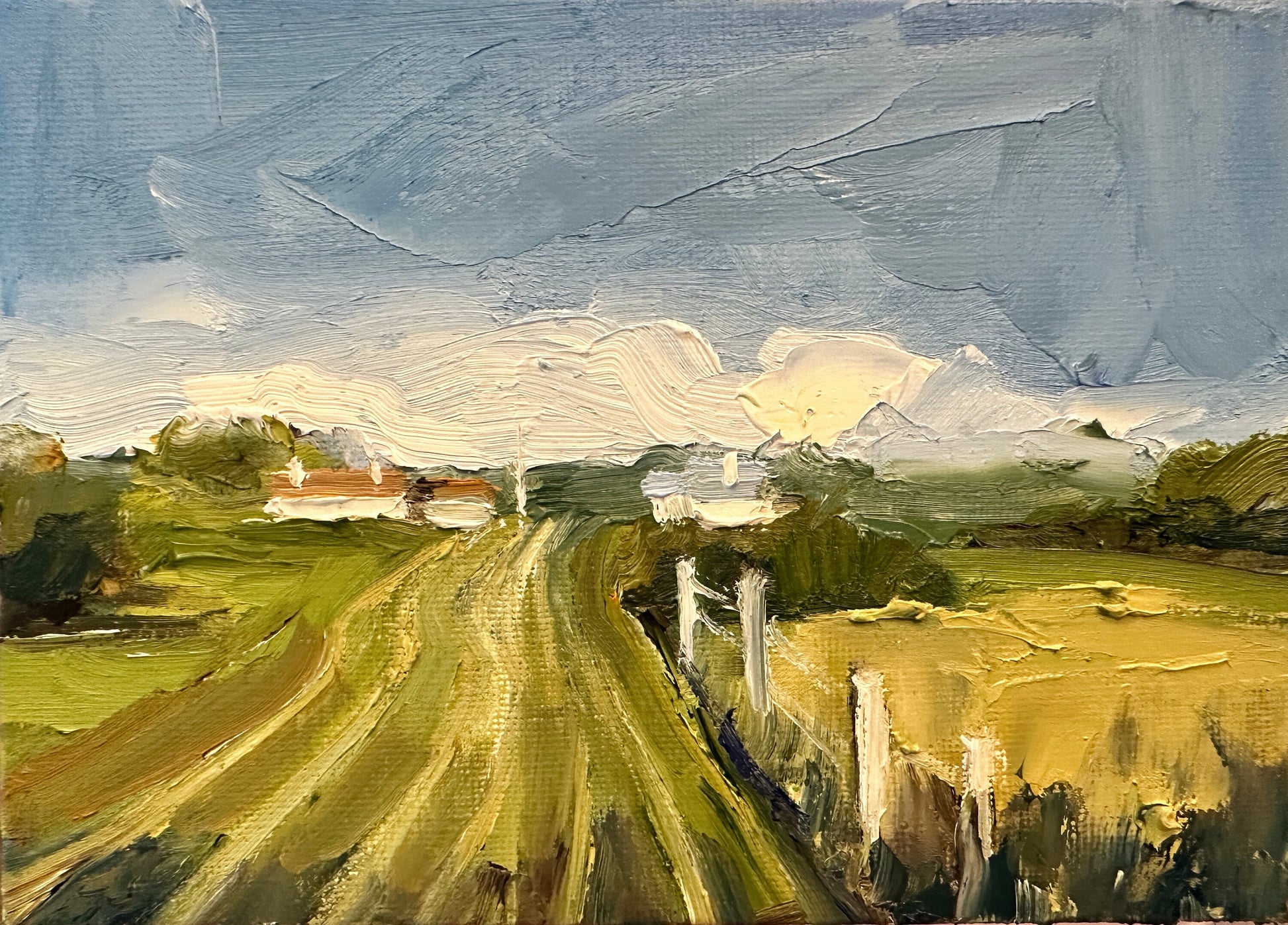 A warm, abstract impression of a quiet farm at golden hour. Bold textures and soft light capture the peaceful charm of rural life, making this small canvas a perfect accent for cozy, rustic interiors.