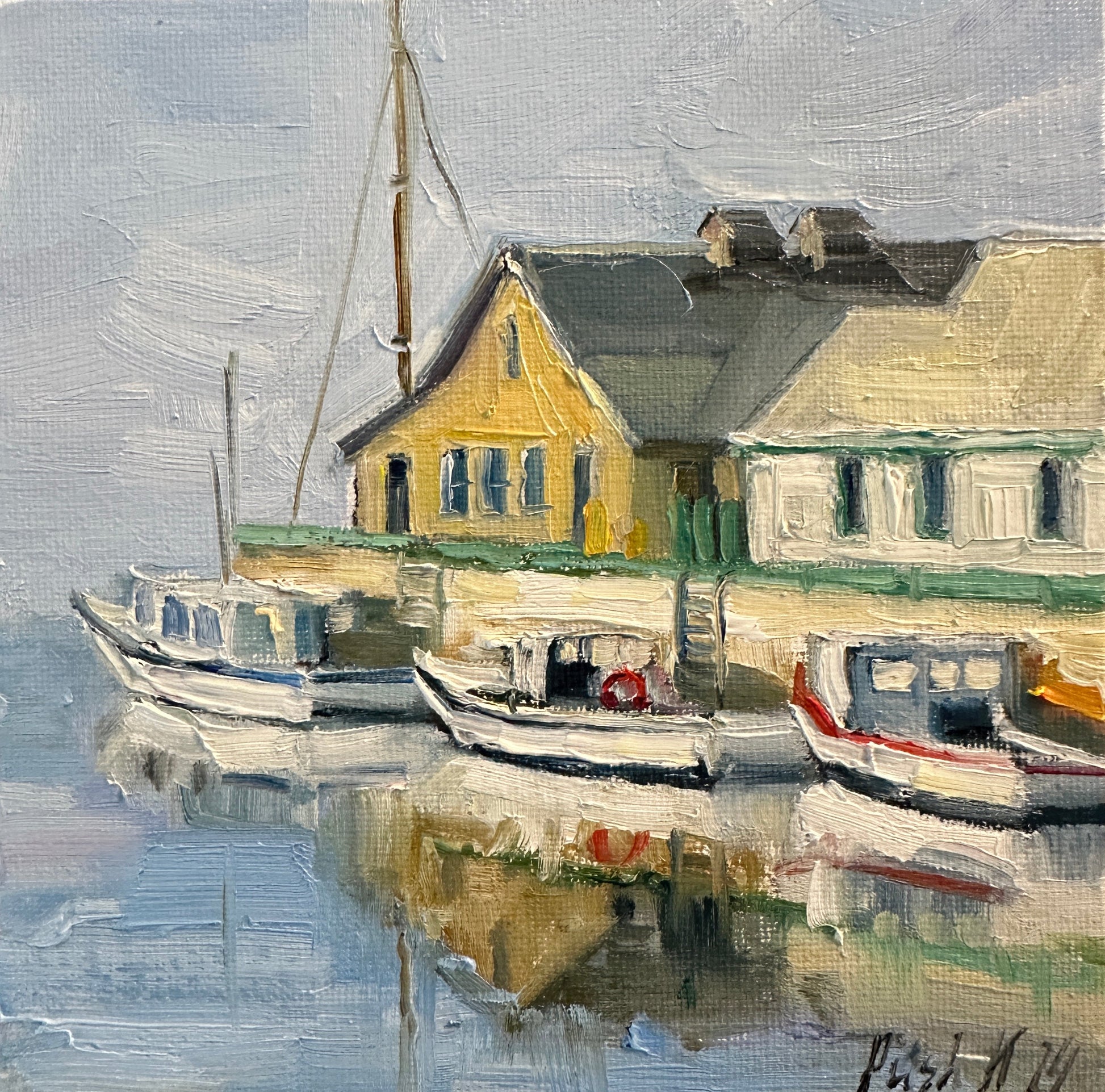 Harbor oil painting on canvas for new home wall decor. Boat painting painting for gift. Fishing boats art for shelf decoration. Coastal framed art for wall decor.