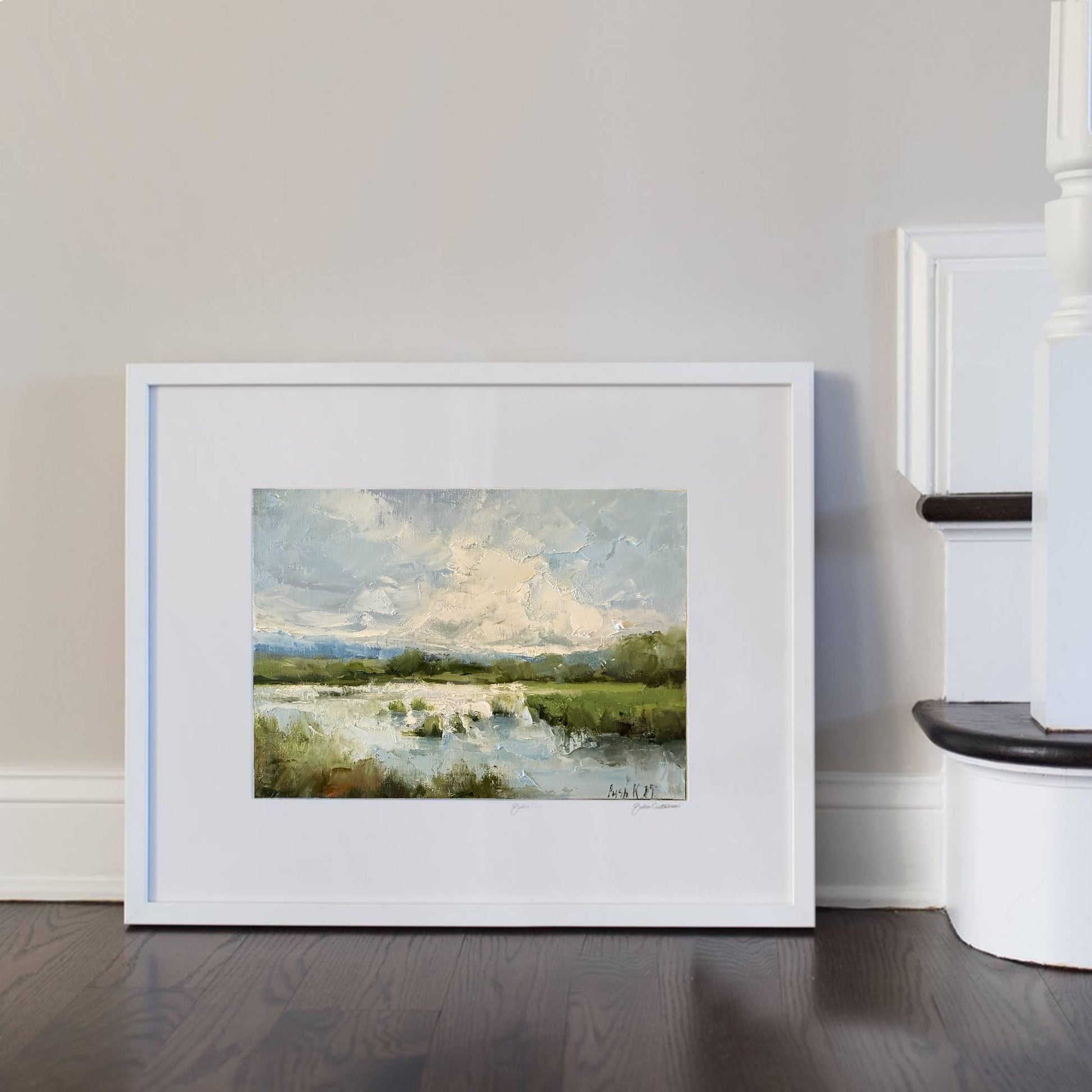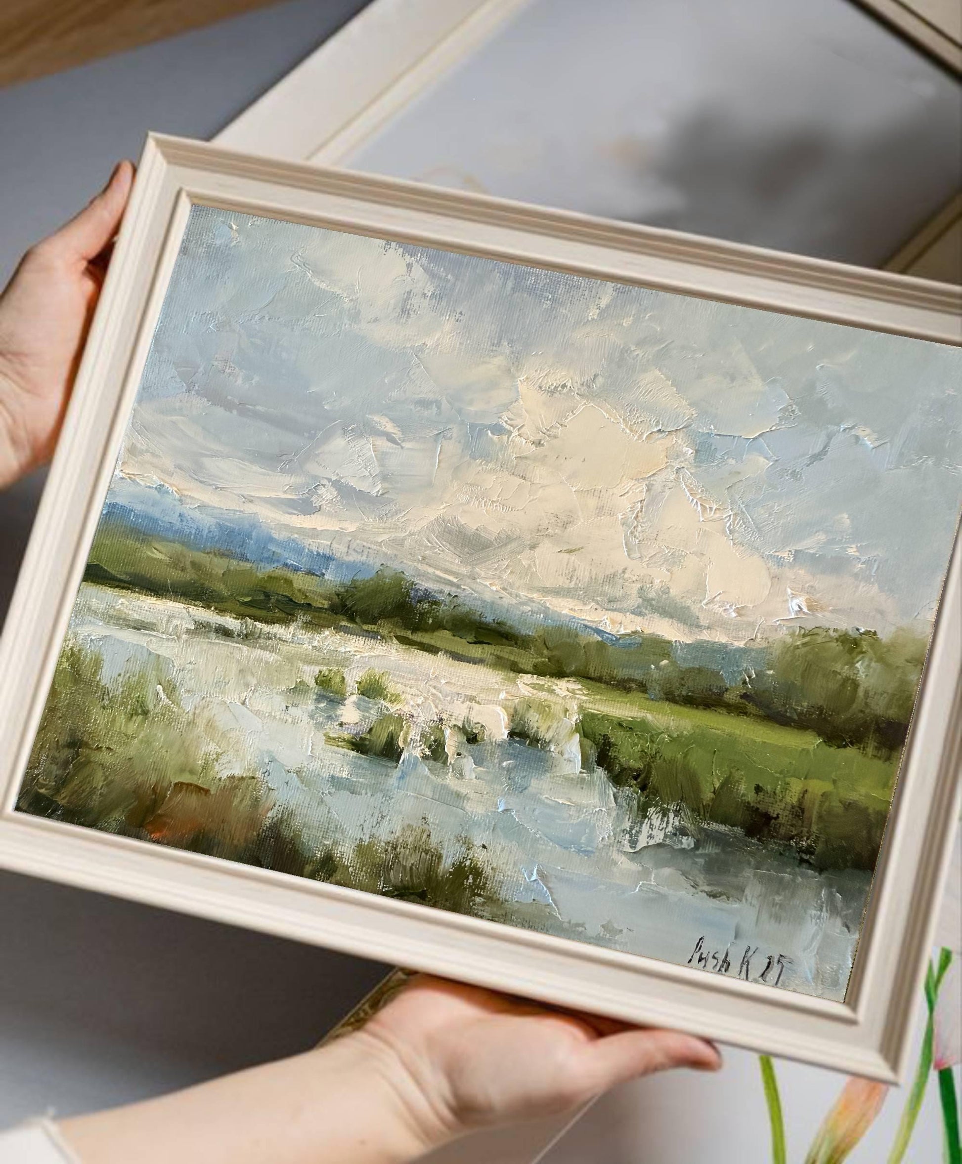 lake art landscape oil painting on canvas for home wall decor, low country nature artwork for room decoration, cloud painting palette knife original signed oil painting.