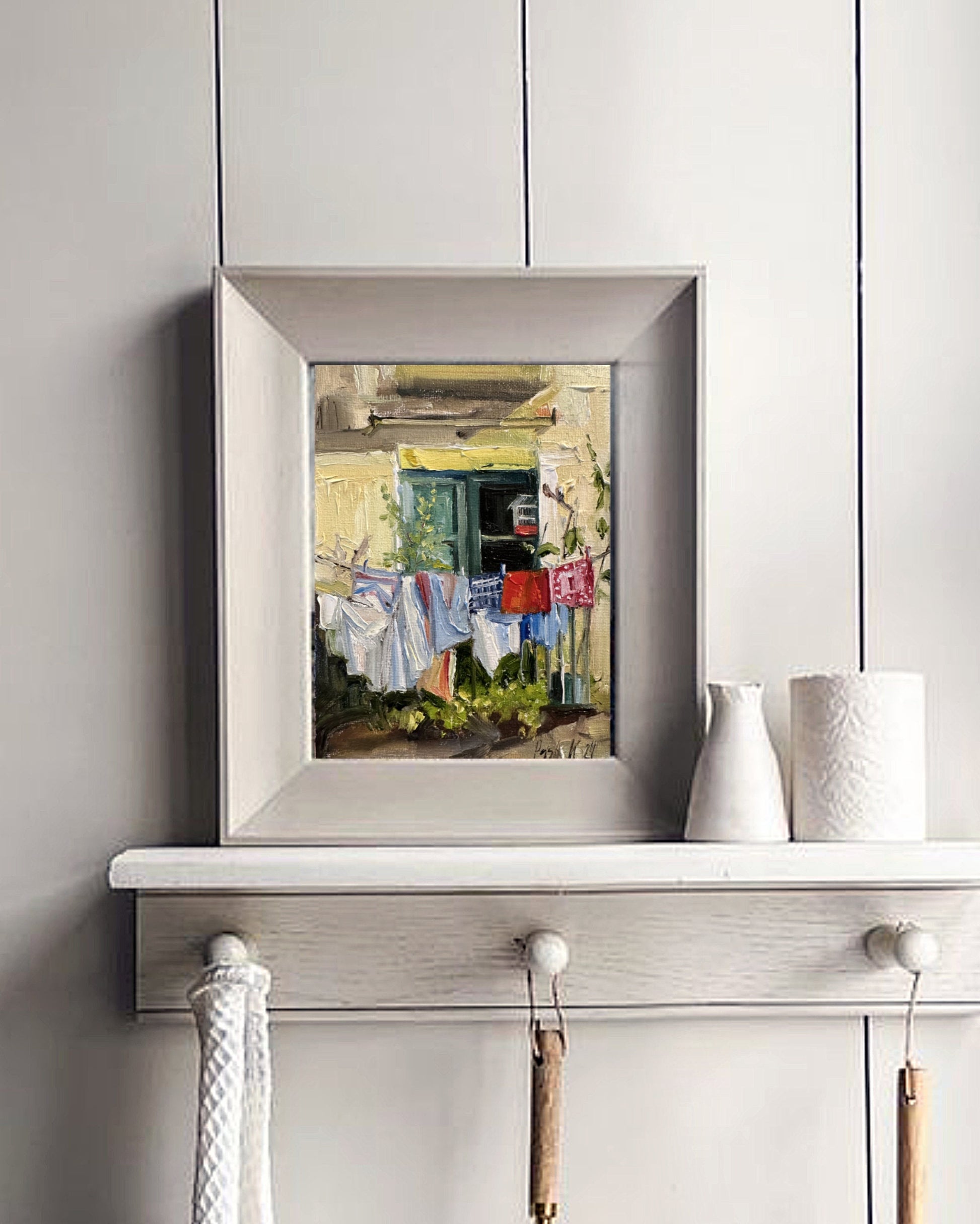 Laundry room art canvas oil painting for new home wall decor. Clothesline oil painting for gift. Balcony art for wall decor.