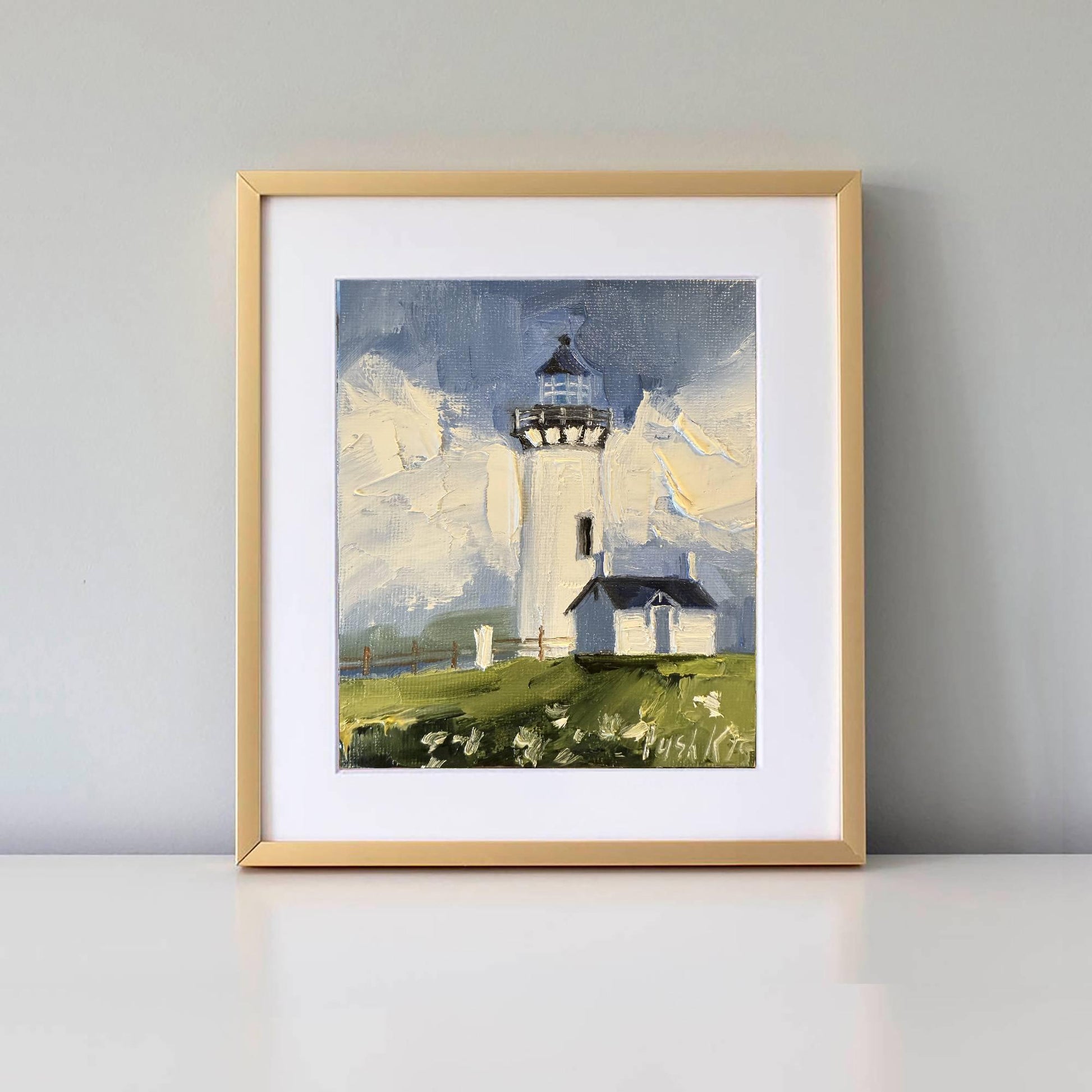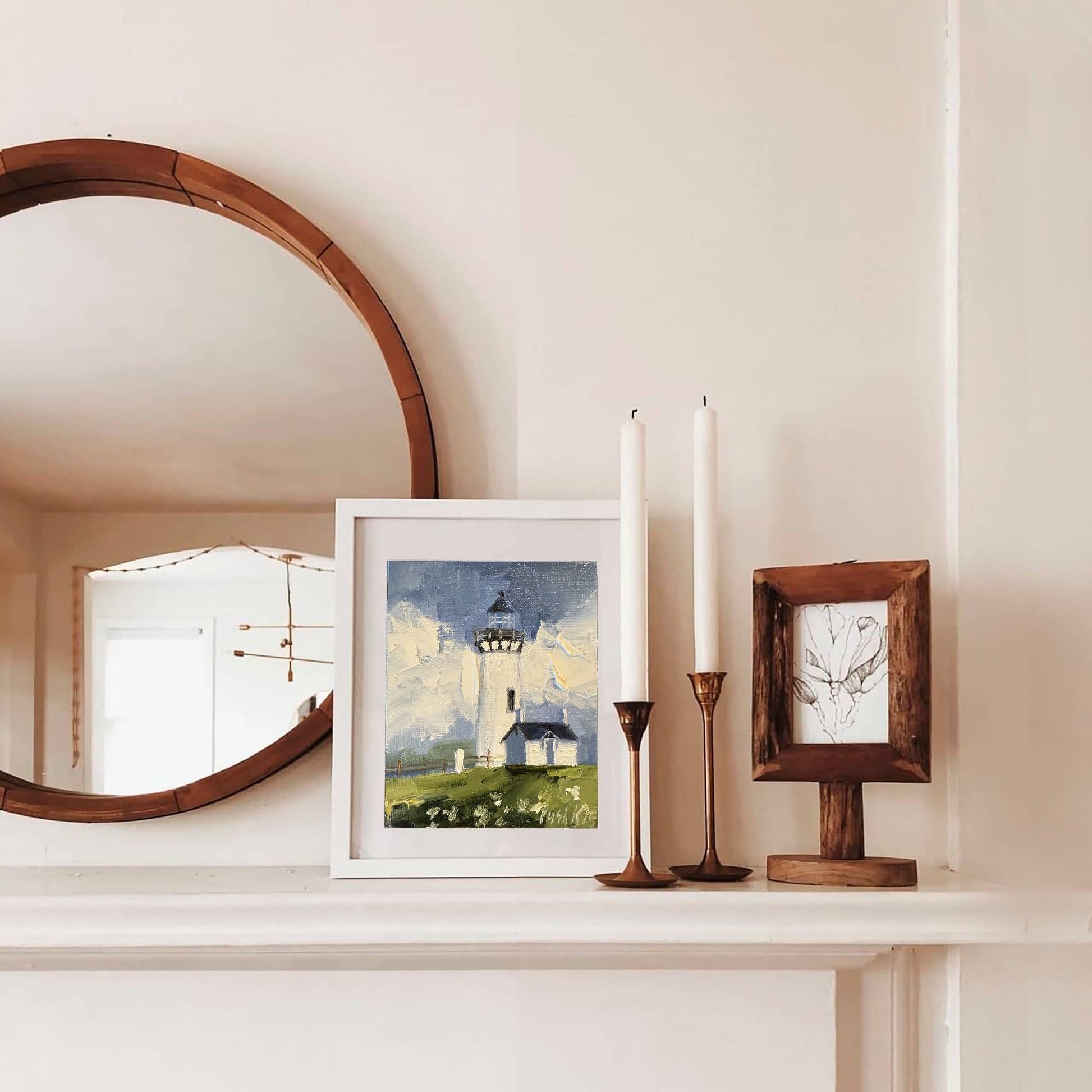 Lighthouse original oil painting on canvas for home wall decor. Oregon coast original artwork for interior wall decor. Lighthouse oil art for gift. White lighthouse mini canvas painting for shelf decoration.