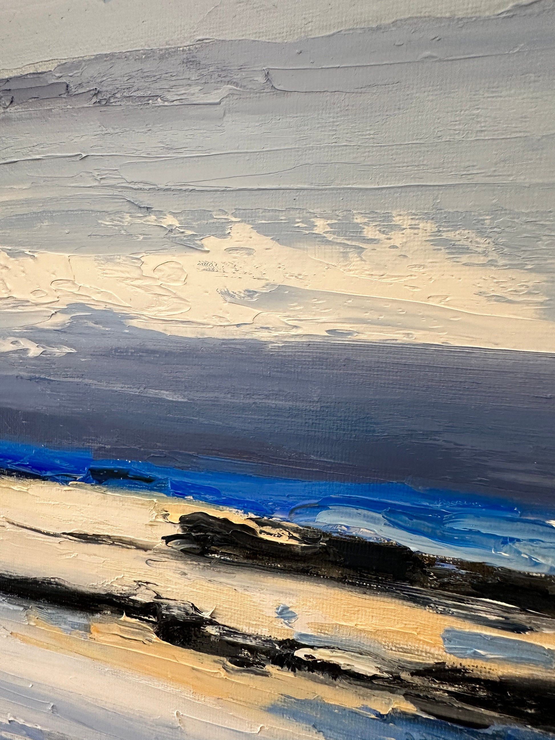 Inspired by the ever-changing sea, this textured abstract captures the depth and movement of ocean waves in soothing blues and earthy tones. A peaceful, modern piece that brings a coastal calm to any space.