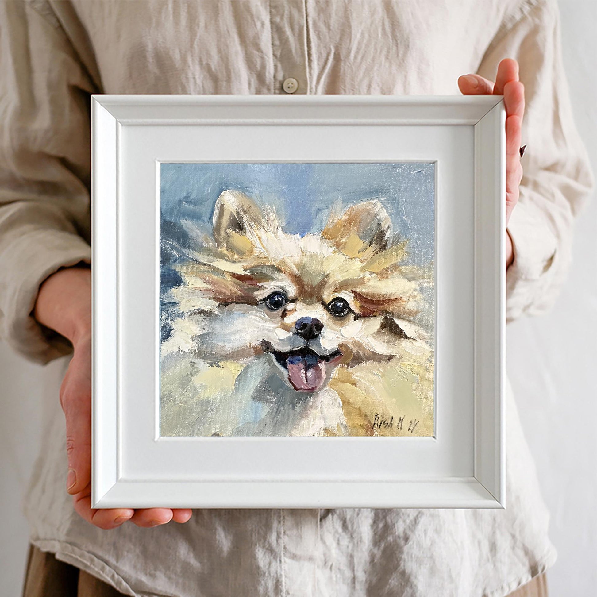 Pomeranian spitz dog oil painting for home wall decor. Dog portrait miniature art for animal lover gift. Funny pet portrait for home decoration.